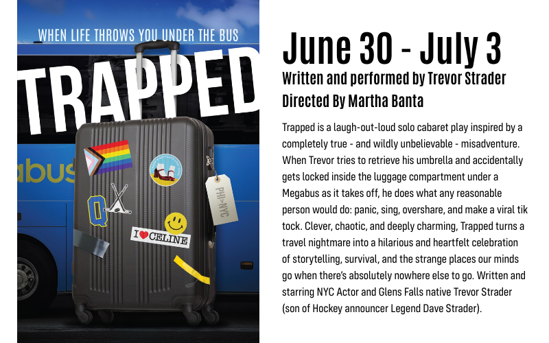 Trapped is a laugh-out-loud solo cabaret play inspired by a completely true - and wildly unbelievable - misadventure. When Trevor tries to retrieve his umbrella and accidentally gets locked inside the luggage compartment under a Megabus as it takes off, he does what any reasonable person would do: panic, sing, overshare, and make a viral tik tock. Clever, chaotic, and deeply charming, Trapped turns a travel nightmare into a hilarious and heartfelt celebration of storytelling, survival, and the strange places our minds go when there’s absolutely nowhere else to go. Written and starring NYC Actor and Glens Falls native Trevor Strader (son of Hockey announcer Legend Dave Strader).