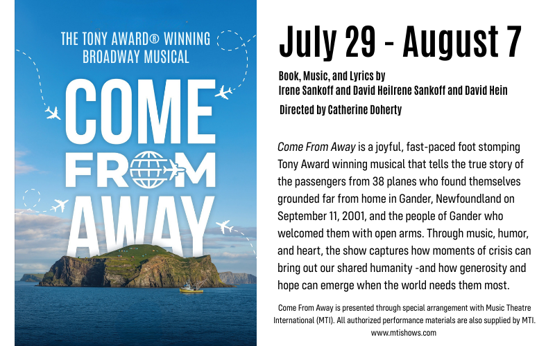 Come From Away is presented through special arrangement with Music Theatre International (MTI). All authorized performance materials are also supplied by MTI. www.mtishows.com